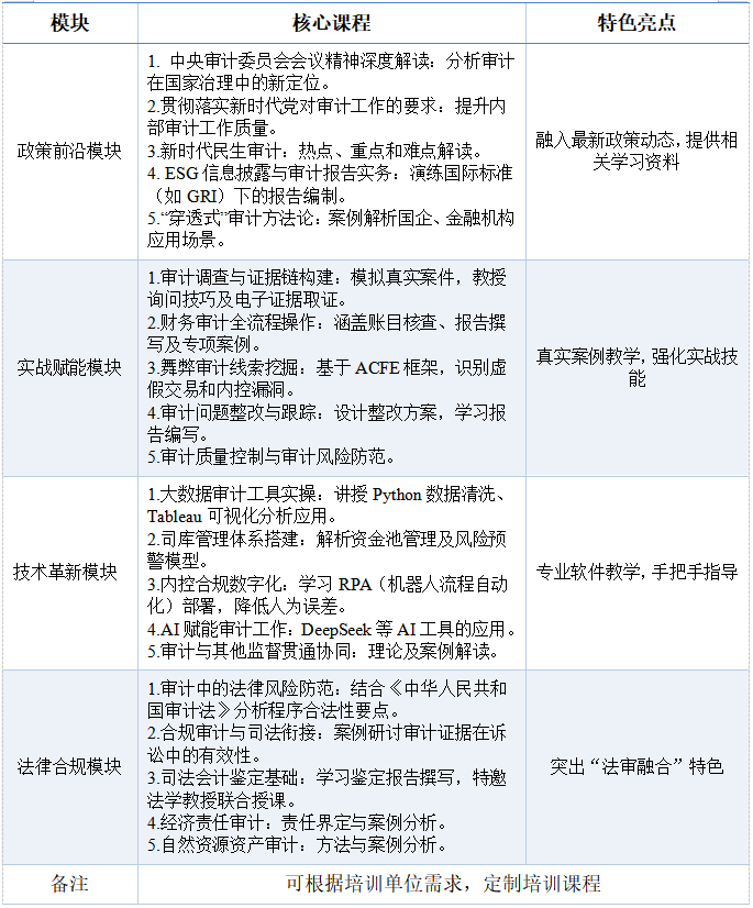 以陕西省审计厅干部培训基地、陕西省高校大数据审计实验室为依托,发挥西北政法大学“法学+商科”等多学科优势,整合本校审计专业师资力量及审计实务部门专家资源,为审计从业人员提供权威、前沿的学习培训平台。