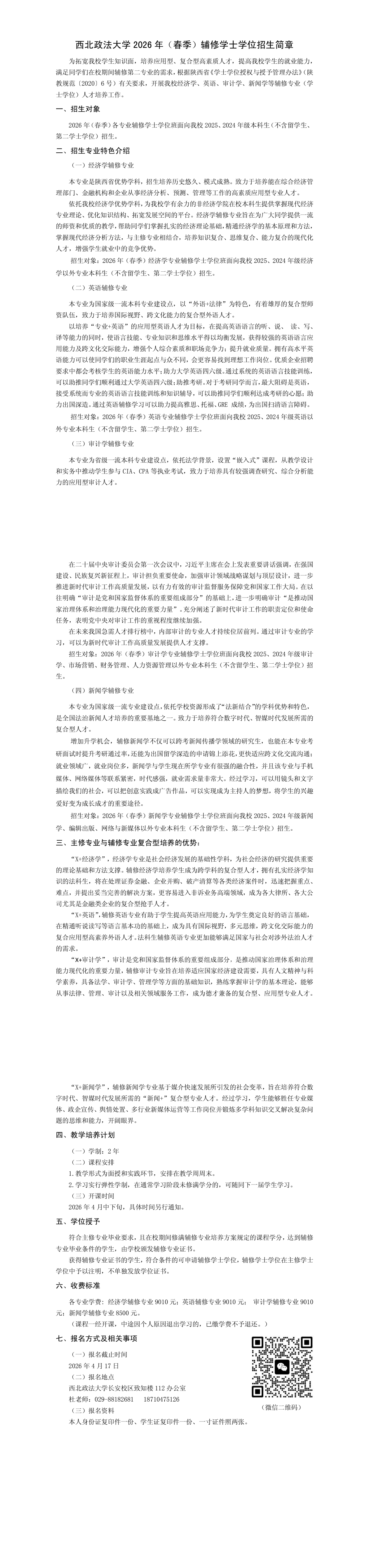 西北政法大学 2026 年(春季)辅修学士学位招生简章