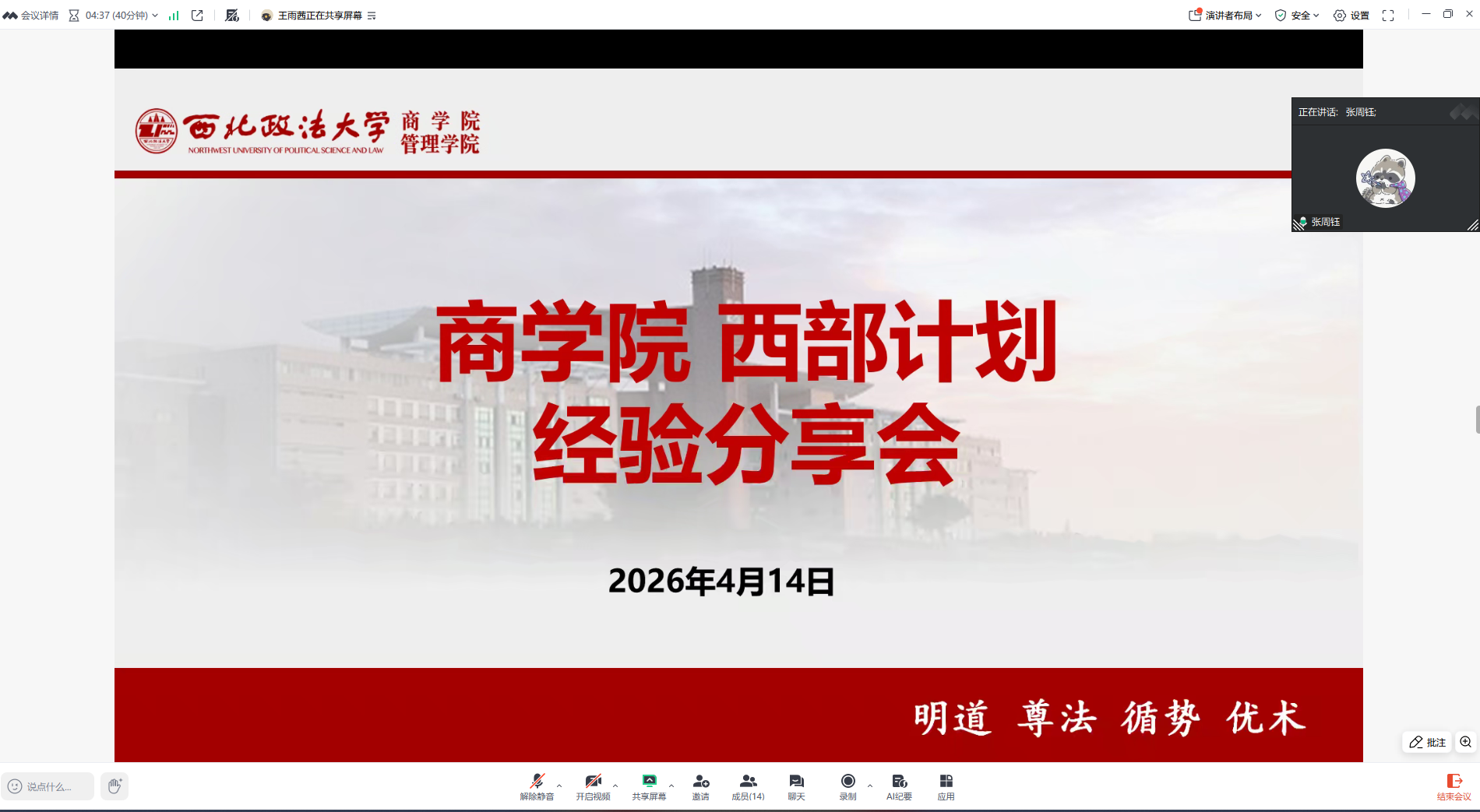 为深入贯彻落实大学生志愿服务西部计划相关工作要求,引导和鼓励棋牌平台 青年学生扎根基层、服务西部、奉献社会,4月14日中午,学院举办西部计划经验分享会。会议由辅导员蔡冰冰主持,毕业年级学生代表参加本次活动。