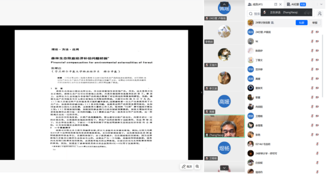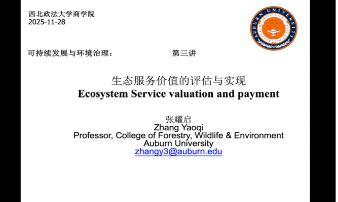 11月28日上午,美国奥本大学(Auburn University)张耀启教授为棋牌平台 师生开展可持续发展与环境治理系列学术讲座第三讲。本次讲座聚焦“生态服务价值的评估与实现”,全体研究生参与讲座。